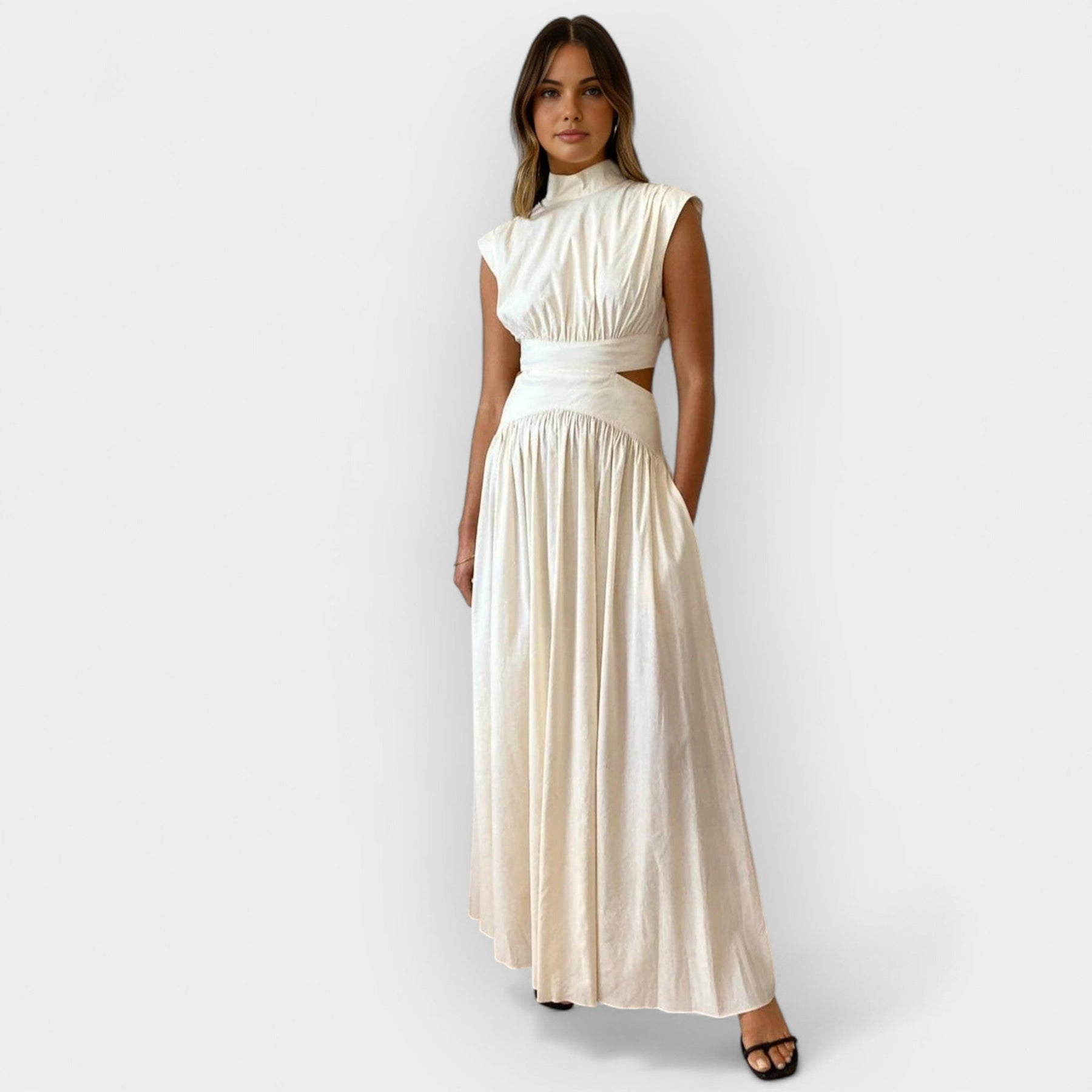 Atraskite įspūdingą suknelę, kuri derina uždarą iškirptę su moderniais atvirais elementais, sukurdama šiuolaikišką ir moterišką siluetą. Puikiai tinka ypatingoms vakariniams pasirodymams su subtiliu drąsumu.